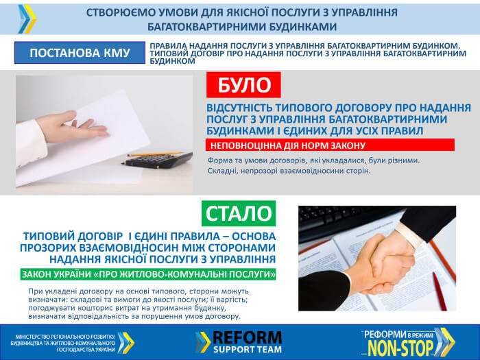 Ми затвердили довгоочікувані документи — Правила надання послуги з управління багатоквартирним будинком та Типовий договір. Ці документи повноцінно запускають ринок управління багатократними будинками, і стимулюватимуть його розвиток на конкурентних засадах. Це ще один дуже важливий крок до забезпечення якісних житлово-комунальних послуг та прозорості відносин між співвласниками багатоповерхівок та управителями. Про це на своїй сторінці у FB повідомив Віце-прем’єр-міністр – Міністр регіонального розвитку, будівництва та ЖКГ України Геннадій Зубко.